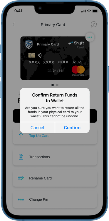 For security purposes, Shyft physical cards are not automatically linked with funds in your currency wallets. You will need to ensure that you transfer funds from your currency wallet to your physical card for it to function. This is done in the appropriate Shyft currency wallet, accessible via the Transact tab or Quick Actions drop-down menu on the app's Globalview screen.